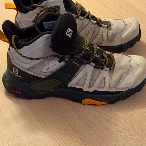 Salomon tursko i størrelse 40 2/3. Skoene er i hovedsak svarte med lyse kontrastdetaljer. Overdelen er i syntetisk materiale og tekstil med snøring foran. Sålen har grovt mønster som gir godt grep på variert underlag. Egnet som tursko og fritidssko i terreng og på sti. Gore-tex, vanntett. Modell X ULTRA 360 MID GTX. Skoene er kun brukt et par uker og ble kjøpt nye i slutten av februar på salg til rett over 1500kr (full pris 1895kr). Skoene selges da de er litt feil passform for min fot og jeg trenger en halv størrelse opp.