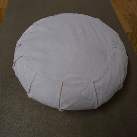 Yogasett bestående av yogamatte, rund meditasjonspute og bærebag i naturfarget tekstil.