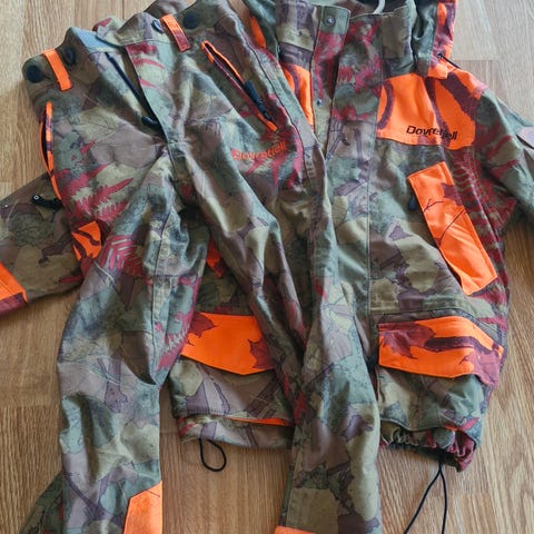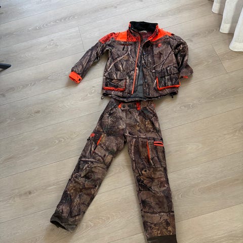 Mackenzie Kids Camo jaktsett for barn i størrelse 120 cm Sett med jakke og bukse i kamuflasjemønster med oransje felt for synlighet. Jakken har flere lommer, glidelås og knappelukking, samt meshfôr på innsiden. Buksen har lommer og beltehemper. Egnet som yttertøy til jakt, friluftsliv og uteaktiviteter for barn.