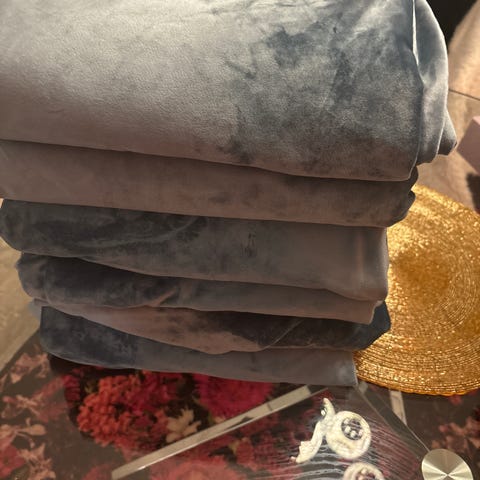 Mange meter med velour duker i forskjellige farger. Noe ubrukt