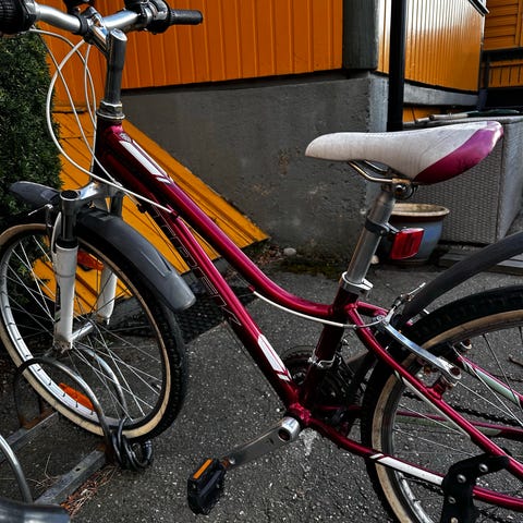 Passer til bruk på vei og enkle grus- og skogsstier, avhengig av utstyr og dekk som følger med. Rammen har feste for vanlig sykkelbrems- og girutstyr dersom dette er montert. Sykkelen oppbevares innendørs i bod/garasje på bildet.
