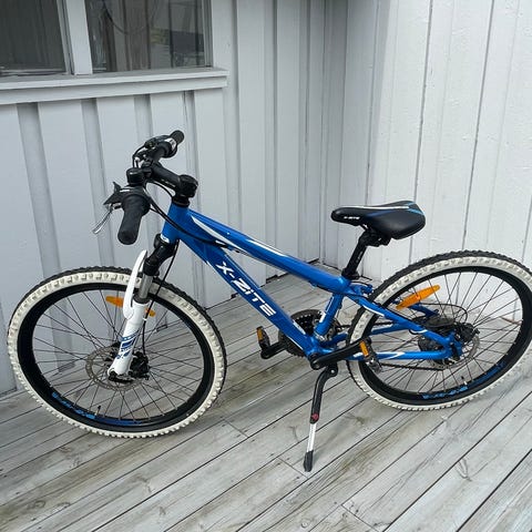 Xceed barnesykkel med 24" hjul. Sykkelen har blå ramme med tydelig Xceed-logo og oransje holker på styret. Egnet som barnesykkel i størrelse 24", typisk for større barn.