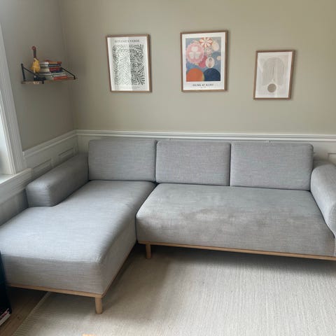 Pent brukt sofa med sjeselong i fin grønn/grå farge.
