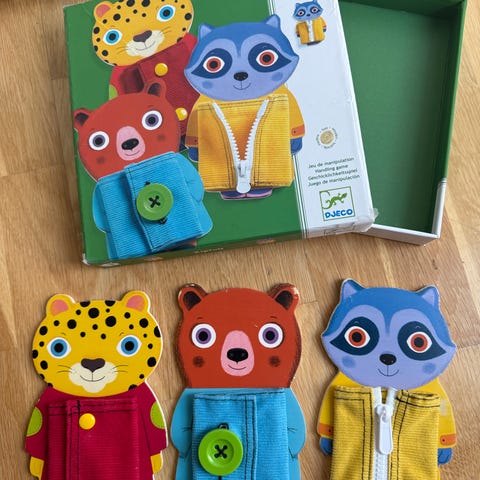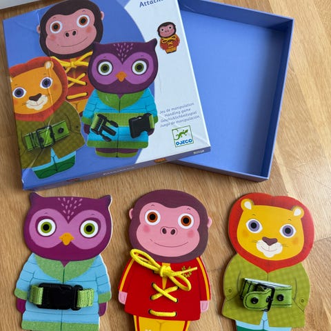 Med disse søte dyrefigurene fra Djeco kan barna lære seg basiskunnskaper! Her kan de øve seg på å åpne ulike låser. Figurene er laget i tre, malt i fine farger og er laget slik at barna skal åpne kattehuset til katten, bildøren til reven og kofferten til bjørnen med de ulike låsemekanismene. Dette er fine øvelser for finmotorikken!