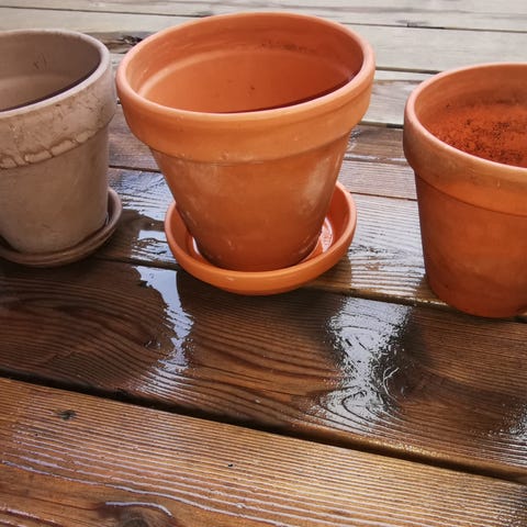 Keramiske blomsterpotter i ulike utførelser. Én potte er blå med dekorative striper og mønster (disse har overflateskitt/mose på som kan børstes bort med litt kjærlighet). Den andre er mørk med lyst plante- eller stråmotiv. Begge pottene har dreneringshull i bunnen som gjør dem egnet til planting av blomster eller andre planter. Passer til utebruk.