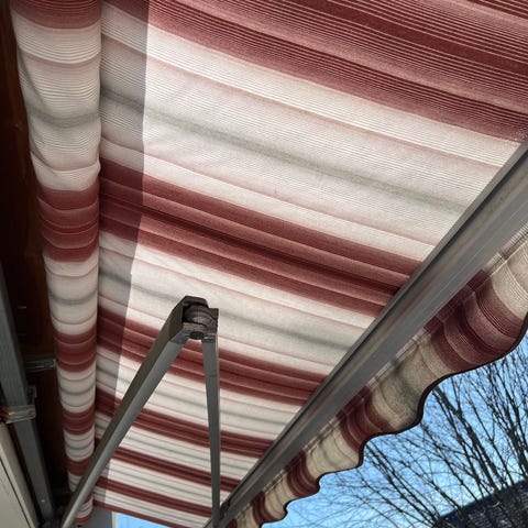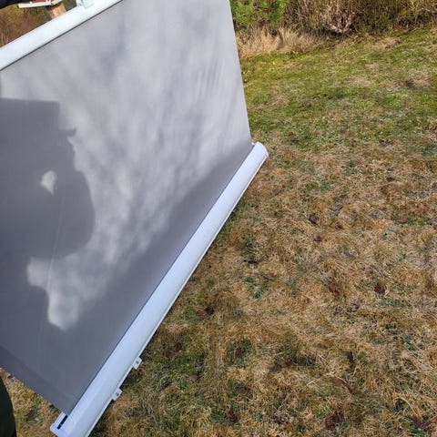 Markise med veggfester i grå utførelse. Leveres med beslag, bolter og skruer for montering på vegg. Duken er rullegardin-type som kan sveives ut og inn med håndsveiv. Egner seg for montering over terrasse eller uteplass for å gi skygge og skjerming. Den er 3 meter bred, duken tror jeg var ca 2.5 meter. Den ene bolten knakk i 2 når vi tok den ned.