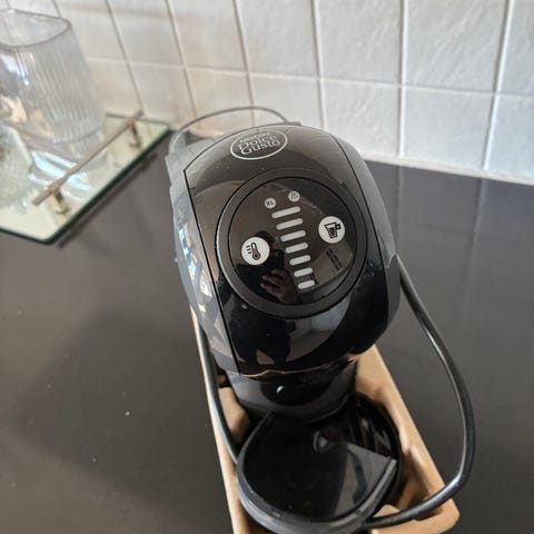 Dolce Gusto kapselmaskin i svart og hvit utførelse. Maskinen bruker kaffekapsler til tilberedning av kaffe og andre varme drikker. Den har vannbeholder på baksiden og dryppbrett foran.