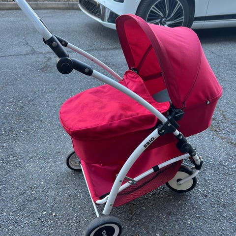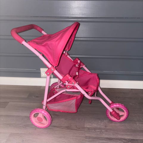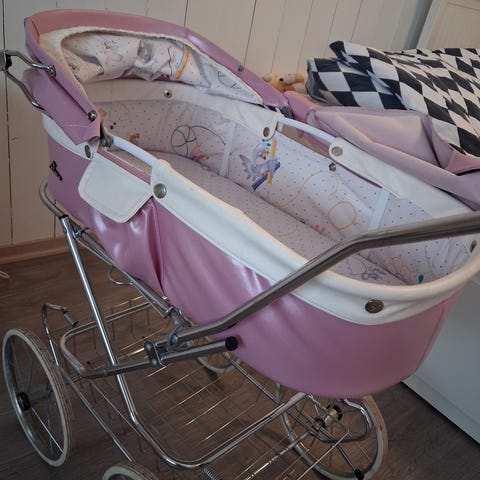 Godt brukt dukkevogn selges billig. Det er en del merker og flekker, men ruller fint og kan fortsatt bli lekt med.