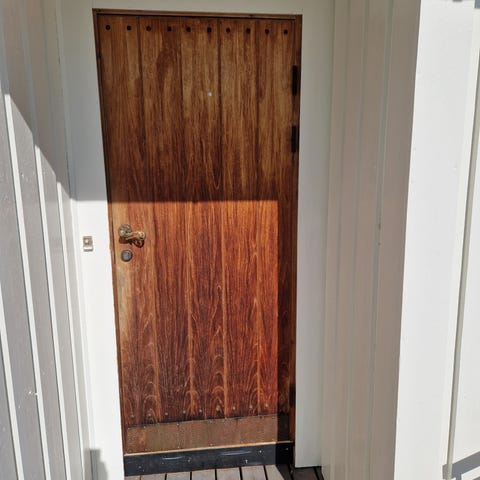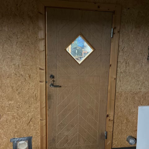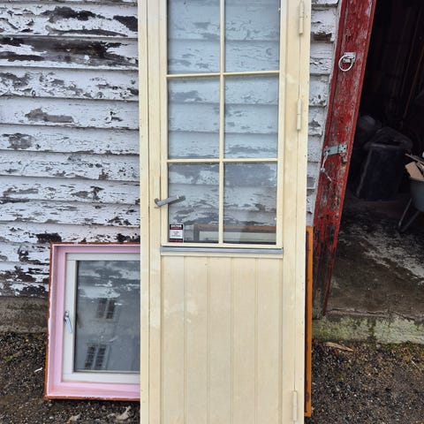 Ytterdør i tre med rektangulært glassfelt øverst. Døren har innfelt låskasse og håndtak, og er hengslet i karm. Overflaten har synlige bruksspor og slitasje, spesielt nederst på dørbladet. Egner seg som ytterdør eller boddør der det er behov for en enkel tredør med glassfelt. Mål og tykkelse bør kontrolleres ved henting eller etter avtale med selger.Str 100cm×210cm. Med dørelås/nøkler og handtak.Må he tes