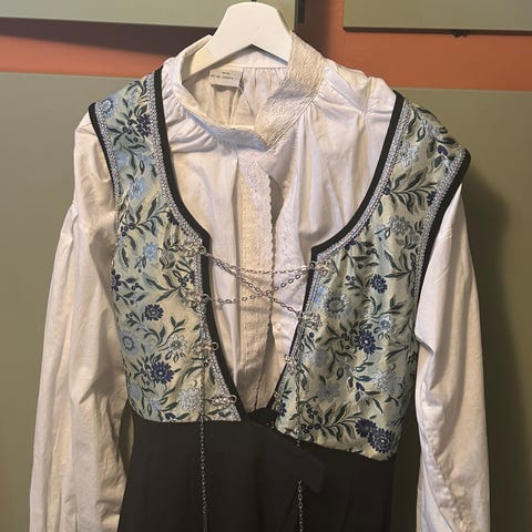 Festdrakt med skjorte og cape,kjøpt på Sparkjøp. Kun brukt 1 gang. Selges da den er blitt for stor. Følger også med ekstra knapper og hemper.