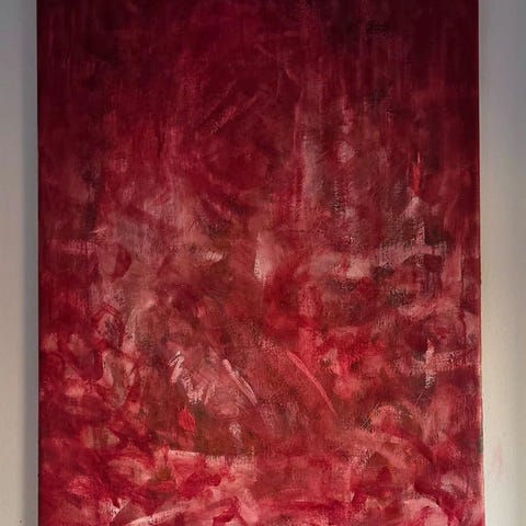 Abstrakt maleri på lerret i røde og mørke toner. Bildet har et ikke-figurativt motiv med ujevne fargefelt og struktur. Passer som veggdekor i stue, gang, soverom eller kontor. Maleriet er montert på lerett og kan henges direkte på vegg. Størrelse 60 h 40 b. Trykk på mellomromtasten for og se store bilder
