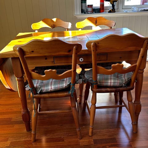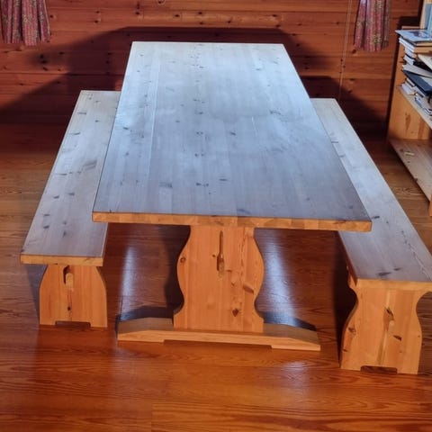 Spisebord i heltre furu i brun utførelse. Rektangulær bordplate med synlig trestruktur og avrundede hjørner. Bordet har kraftig understell i heltre som gir stabilitet. Passer som spisebord på kjøkken eller i spisestue. Eventuelle stoler og benk på bildene er egne møbler som kan inngå i settet dersom det er oppgitt i annonsen.