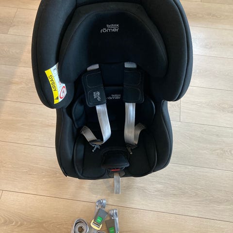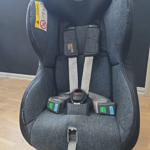 Britax Römer Max-Way Plus barnesete for barn opptil 25 kg. Setet monteres bakovervendt med bilens trepunktsbelte og medfølgende forankringsstropper. Det har intern 5-punktssele, justerbar hodestøtte og polstrede skulderputer.