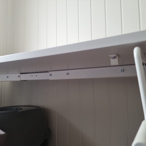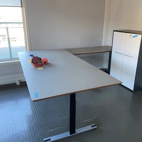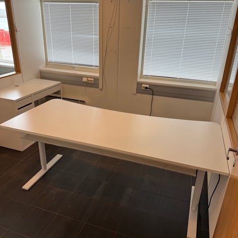Selger unna masse skrivebord med hev senk i forskjellige størrelser og fasonger.