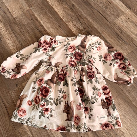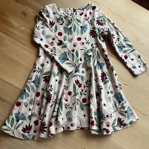Søt snurrekjole fra Polarn O. Pyret kjole for jente i størrelse 104. Kjolen er i bomull med flerfarget blomstertrykk på lys bunn. Langermet modell med rund hals og volangdetaljer på skuldrene. Lukkes med knapper i ryggen.