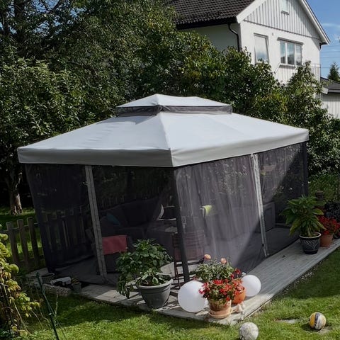 Paviljong 4x3m med sort metallramme, grått stoff til tak/vegger og myggnetting.