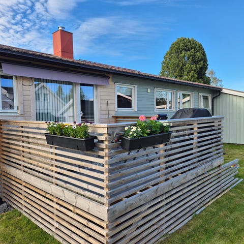 Ramme står løst på terrasse, kan demonteres ved henting