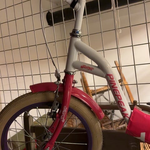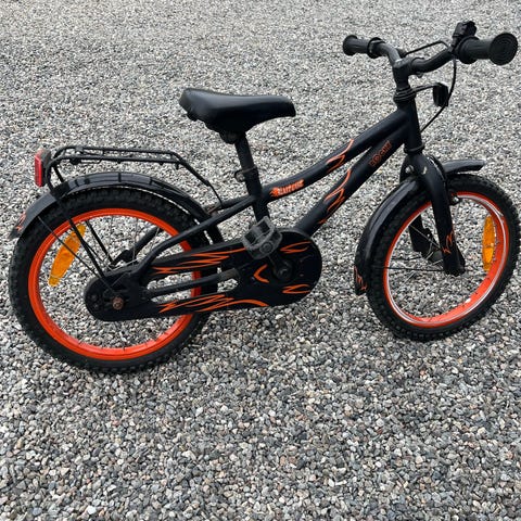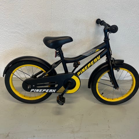 Pinepeak barnesykkel med 16" hjul i svart og gul farge. Sykkelen har lav innsteg-ramme som gjør det enklere for barnet å komme seg av og på. Utstyrt med skjermer foran og bak samt kjedekasse som dekker kjedet. Passer til barn som bruker 16" hjulstørrelse, typisk i overgangen fra balansesykkel til større barnesykkel. Sykkelen er godt brukt. Men med godt vedlikehold kan den gå i arv i mange år til.