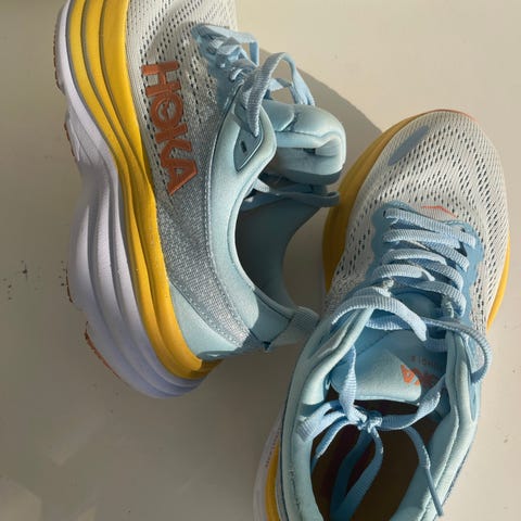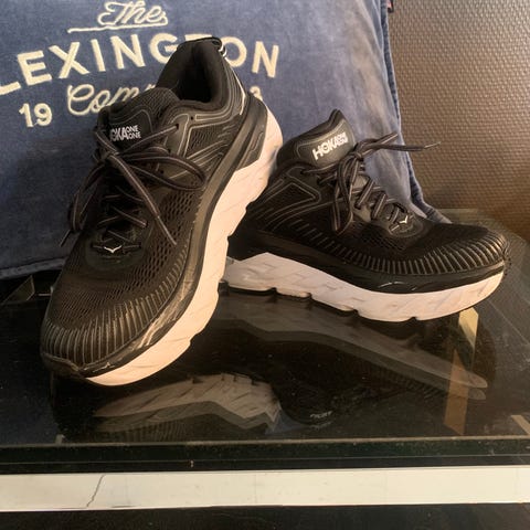 Hoka løpesko i størrelse 38. Skoene er laget for løping og har en tykk mellomsåle for demping. Overdelen er i pustende meshmateriale i blåtoner med sorte detaljer og snøring. Yttersålen har mønster for grep på underlaget. Egnet til løping og annen trening på hardt underlag.