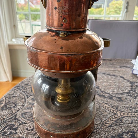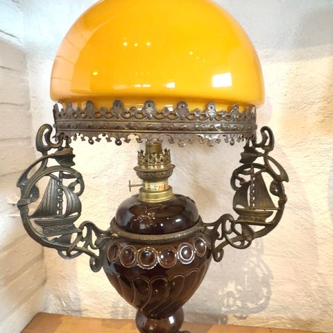 Parafinlampe i messing med glassylinder. Lampen har rund tank i metall og klassisk brenner med justerbar vekeholder. Glassylinderen er høy og smal, festet i metallkrone på brenneren. Egnet som belysning og dekorasjon i innemiljøer der man ønsker bruk av parafinlampe. Ingen merkevare eller modellnavn er synlig på bildene. Kan henge på vegg!