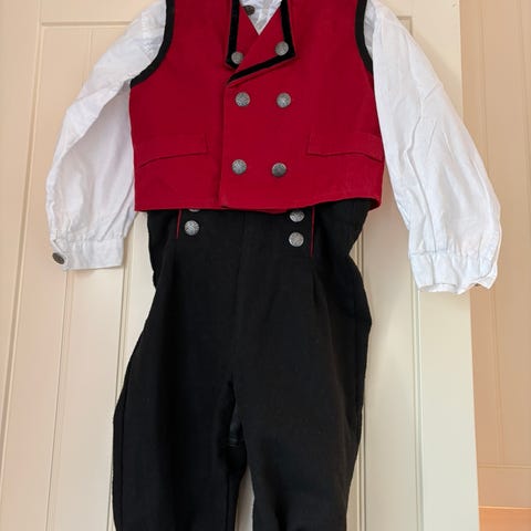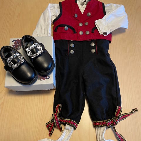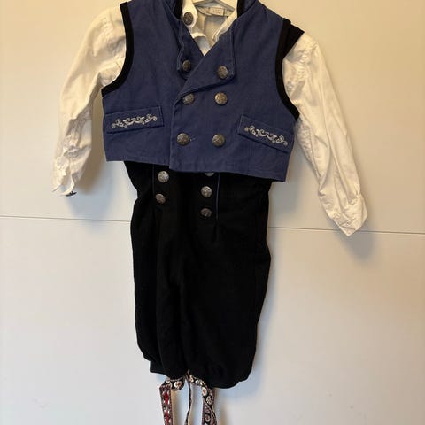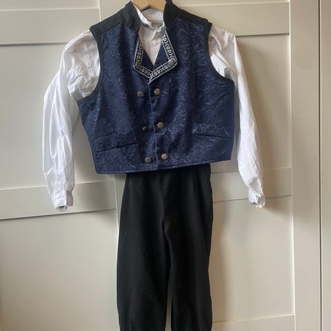 Pent brukt festdrakt fra Småtroll, kun brukt to ganger. Pakken inneholder festdrakt med bukse, vest og skjorte, samt lange strømper. Den ene strømpen er noe misfarget nede på foten - men det ser man ikke med sko på. Skjorten har noen svake flekker, disse er ikke forsøkt fjernet utenom skånsom vask.