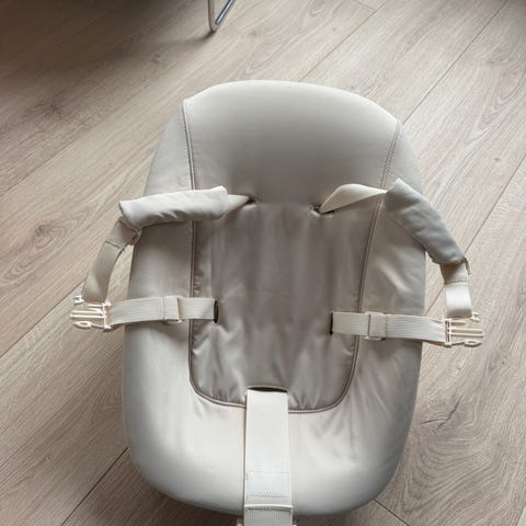 Stokke barnestol i hvit plast med integrerte seler. Stolen har høy rygg og omsluttende sete som gir støtte til barnet. Egnet som innsats på Stokke Step-stol. Nøytral farge som passer inn i ulike interiører. Kan få med et brett også hvis du ønsker, men det er skittent «inni».