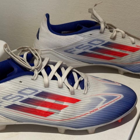 Adidas F50 Pro MG fotballsko i størrelse 44 (EU), 9 1/2 (UK) og 10 (US). Modellen er laget for bruk på multi-ground underlag (MG), som kombinerer faste og kunstige gressbaner. Overdelen har hvit base med blå og oransje detaljer, samt FG/MG-knottesystem i oransje. Skoene leveres i original eske med merkelapper påmontert. Egnet som fotballsko for spillere som ønsker en lett sko til ulike typer gress- og kunstgressbaner.