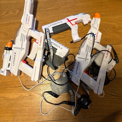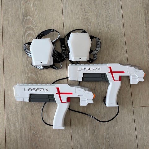 Laser tag pistoler med et slags tårn du kan skyte på og få poeng. Det er veldig lite brukt har bare ligget i skapet. Kan sendes med Helt hjem mot tillegg i prisen.