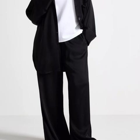 Bik Bok bukse for dame i størrelse L. Buksen er svart og laget av polyester. Modellen har utsvingte ben og er egnet til hverdagsbruk eller mer pyntede anledninger, avhengig av styling. Passer godt sammen med både gensere, topper og skjorter. Lengde 95cm