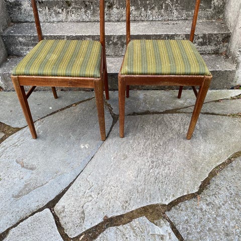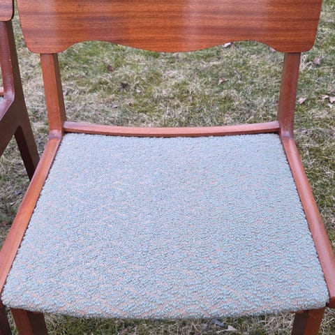 Polstret 70-talls stol med tekstiltrekk og teakben. Egner seg som spisebordstol eller i kjøkken. Stolene har stoppet sete og gir god sittekomfort, men de må trekkes om, (meget slitt stoff!). Understellet er av prima teak og i meget god stand, litt pussing og oljing, så blir de som nye. Enkelt restaureringsprosjekt, hvor en passe nevenyttig person også klarer omtrekkingen. 50 kr pr. stol
