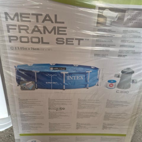 Intex Rectangular Frame Set basseng i rektangulær form. Bassengrammen er laget med metallstenger og bassengduken er i blå PVC. Størrelsen på bassenget er ca. 300 x 200 x 75 cm, egnet for utendørs bruk i hage eller på uteplass. Leveres som sett med ramme og duk, og krever montering før bruk.