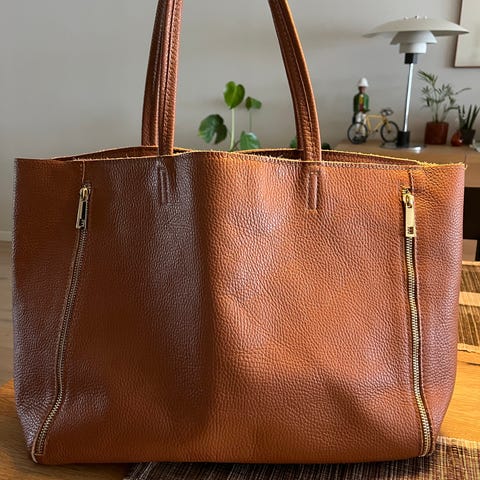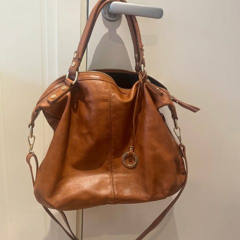Skinnveske fra Elliott Lucca, i mykt kvalitetslær. Selges da den ikke blir brukt. Vesken har hanker av flettet lær og detaljer som tynnere snorer i flettet lær, gullfargete detaljer, glidelåslukning øverst, ett glidelåsrom og to mindre lommer innvendig. Fargen er lys konjakk/gylden. Mest riktig fargegjengivelse på bilder 2-8. Vesken er ubrukt, men har fått noen merker under oppbevaring (se bilde 6) samt et lite merke på undersiden. Disse synes ikke ved bruk, men selges til redusert pris pga det. Kan bæres på skulderen. En kvalitetsveske som rummer mye!