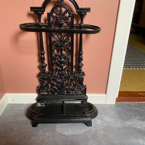 Arcchio paraplystativ i metall i svart farge. Stativet har dekorativt utformet ramme med utsmykkede detaljer og integrert dryppebrett nederst for oppsamling av vann. Egnet for plassering i entré, gang eller andre innendørs områder der det er behov for oppbevaring av paraplyer.