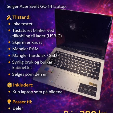 Skjerm knust på venstre side, se bilde. Ellers lite brukt.