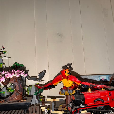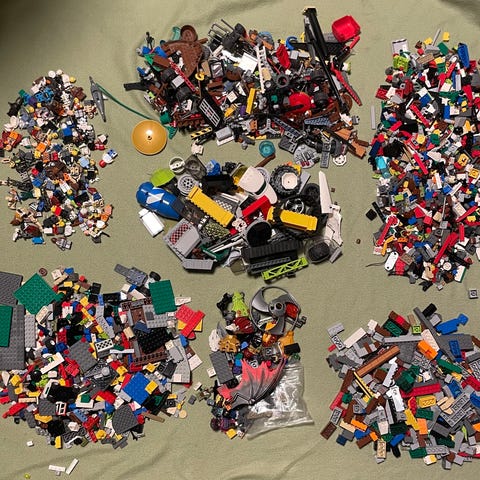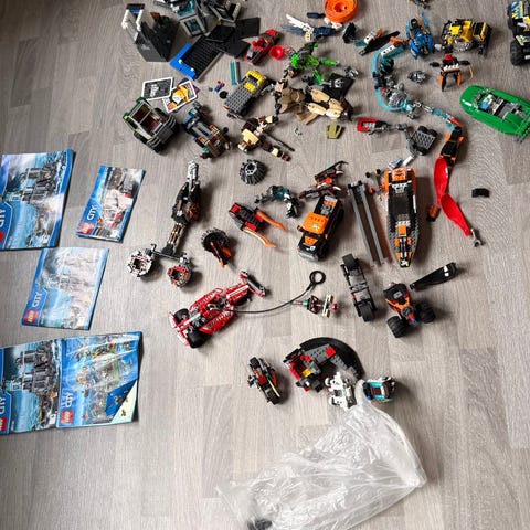 LEGO. Inneholder noen ferdigbygde, se bilder, og klosser og deler til flere Ninjago-modeller, noen hefter medfølger. Garanter absolutt IKKE at det ikke kan være klosser som mangler, da de er bygt for lenge siden. Medfølger også tre esker med uferdig, men disse vet jeg heller ikke om har mangler, ser bare det ligger poser nedi. Fine ekstraklosser, om ikke annet.