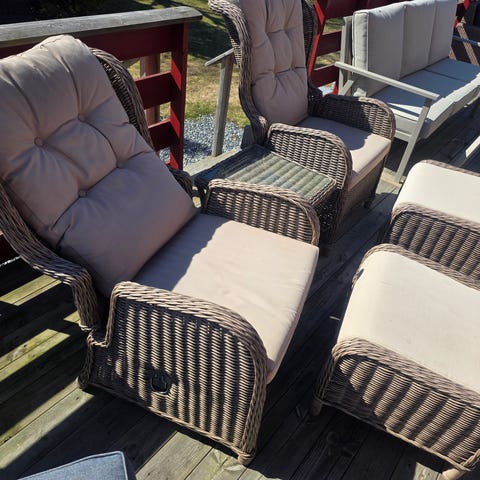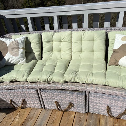 Lengde 170 cm på sete og rygg er 64 cm høy. Den kan legges flatt slik at det kan bli en seng.