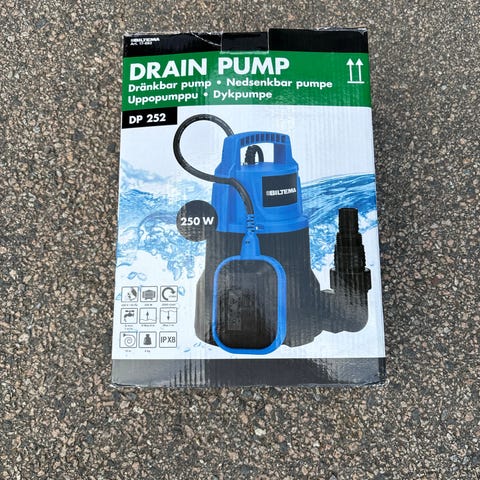 DP 252 drenspumpe med effekt på 250W i blå og svart utførelse. Nedsenkbar pumpe egnet for drenering og pumping av vann, for eksempel fra kjellere, brønner eller basseng. Leveres med flottørbryter og tilkobling for slange på siden av pumpen. Egnet til bruk med rent eller lett skittent vann der drenspumpe er nødvendig.