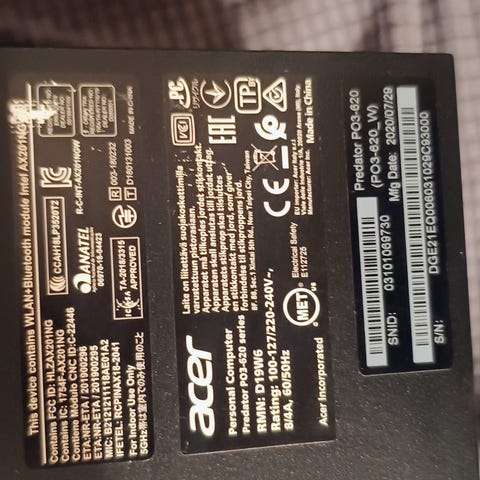 Stasjonær PC fra Acer i Predator-serien, modell P03-640. Kabinettet har frontpanel med netting og flere USB-porter samt lydtilkobling. Maskinen er merket med støtte for NVIDIA-grafikk (GeForce RTX) og har innebygd WLAN/Bluetooth-modul (Intel AX211). Bak på kabinettet finnes standard tilkoblinger for skjerm, nettverk og øvrige enheter.