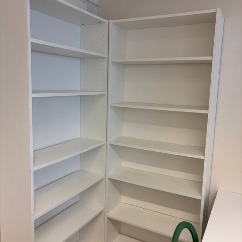 Vi har 6-7 stk Billy bokhyller 80 cm. De er godt brukt og passer til lager. Alle hyllene har vært skrudd inntil hverandre så de har et par små hull på yttersider. Noen flekker og noe svai på noen av hyllene se bilde. Må hentes raskt. Møt helst to til bæring.