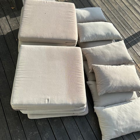 Pent putesett til hjørnesofa og pute til solseng. Farge beige. Sitteputer 5 stk. bredde 64cm dybde 67 cm. Ryggputer 4 stk. bredde 64cm høyde 40 cm. Ryggputer 2stk. Bredde 53cm høyde 40cm. 2 stk. vangeputer bredde 53cm høyde 33 cm. Solsengpute lengde 200cm bredde 70cm