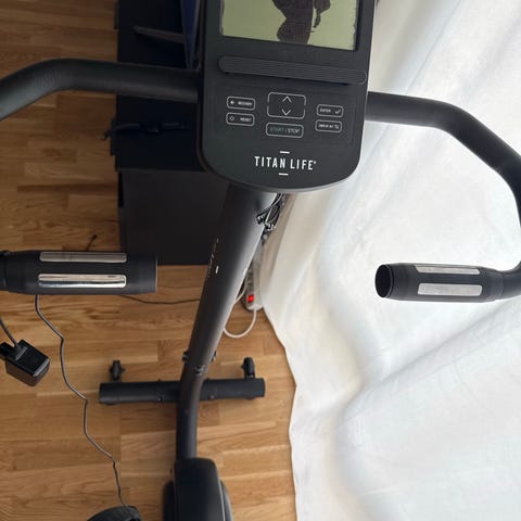 Maxfittrimsykkel i hvit og svart farge. Sykkelen har justerbart sete og styre, samt stabil ramme med bred fot. Egnet til innendørs kondisjonstrening for voksne. Passer til bruk hjemme i stue, kjeller eller eget treningsrom.