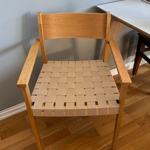 Spisestol med armlener som gir ekstra støtte og komfort. Stolen har sete i vevd polyester og ramme i massiv eik. Treet er lakkert for forlenget holdbarhet.