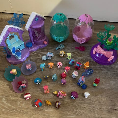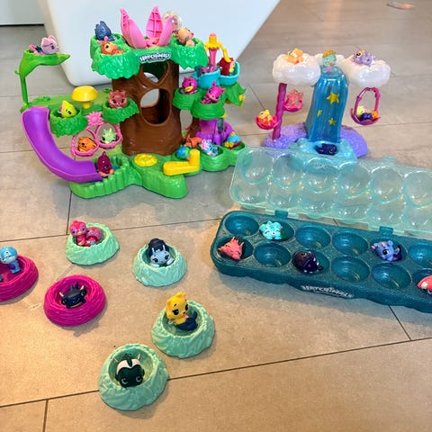 Selger en kjempekjekk samling med Hatchimals leker. To «hus», andre små «hus», reder og mange figurer. Noen figurer er nok like.