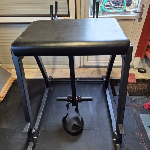 Pilot glute ham raise treningsbenk i svart. Benken har polstrede puter for hofte og legger, samt justerbare ruller for tilpasning til ulike brukere. Stabil stålramme med bred fot gir godt støttepunkt under øvelser. Egnet for trening av bakside lår, setemuskulatur og kjernemuskulatur i treningsrom eller hjemmegym.