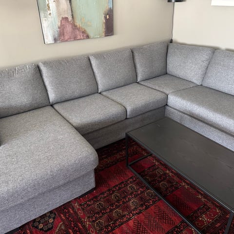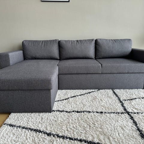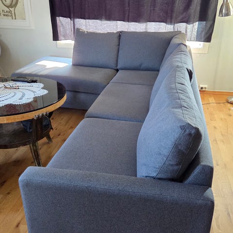 Sofa av god kvalitet, både rygg- og seteputer kan vendes og brukes på begge sider, noe som forlenger levetiden. Trekkene kan tas av og vaskes. Består av to moduler med sjeselong på høyre side (kan ikke vendes). Mulig å utvide med nye moduler om ønskelig. Kommer fra røyke- og dyrefritt hjem.