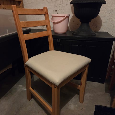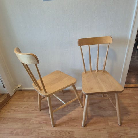 IKEA spisebordstoler designet av Alfred Homann. Stoler med lys treramme og seter trukket i lys tekstil. Egnet som spisebordstoler på kjøkken eller i spisestue. Ryggen har horisontale sprosser som gir støtte og et åpent uttrykk. Passer inn i ulike typer interiør og kan kombineres med ulike spisebord i tilsvarende treverk eller nøytrale farger.