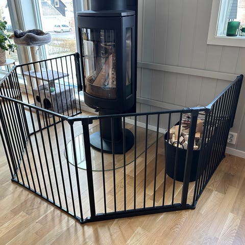BabyDan fleksibel peisgrind i svart metall. Grindens leddede seksjoner kan justeres i ulike vinkler for å tilpasses rundt peis, ovn eller andre områder som skal avskjermes. Innebygd dørseksjon gjør det mulig for voksne å passere uten å flytte hele grinden !😃