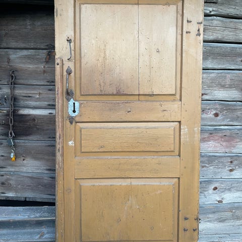 Gammel tredør med klassisk panelutforming og synlig slitasje i overflaten. Døren har rektangulære fyllinger på den ene siden og diagonalt rutemønster i treverket på den andre siden. Overflaten fremstår ubehandlet eller med eldre maling som er slitt. Egner seg til restaurering, gjenbruk i eldre bygg eller som dekorativ innredningsdetalj. Blå dør 1,90x0,70 den andre er 1,30x0,70 gammel bursdør,,, dørene selges til høystbydende