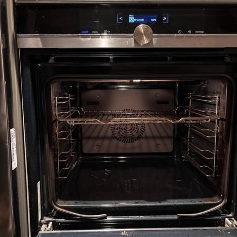 Front i rustfritt stål med glassdør og integrert håndtak. Betjening med to dreieknapper og display i midten. Ovnen er beregnet for innbygging i kjøkkeninnredning.