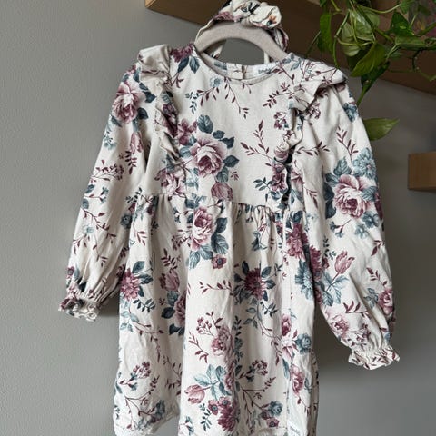 Newbie kjole for barn i størrelse 86 for jente. Kjolen er laget av bomull og har et flerfarget blomsterprint på lys bunn. Modellen har lange ermer med strikk ved håndleddene, rysjedetaljer foran og lett utsvingt skjørt. Passer til hverdagsbruk og enklere selskapelige anledninger.